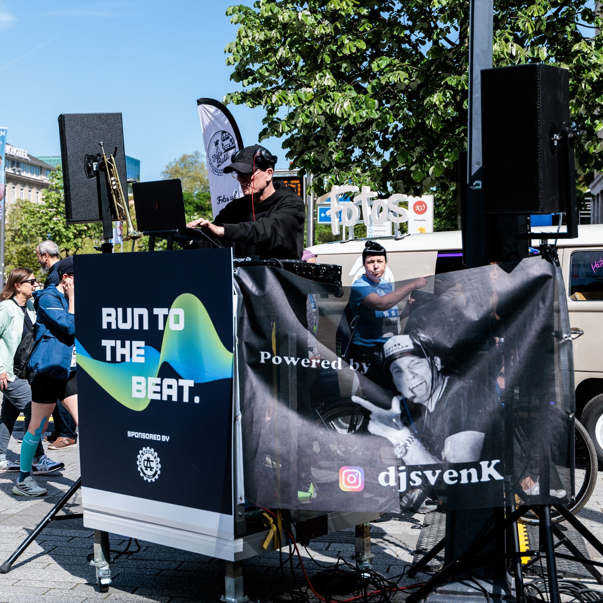 Ein besonderer Bestandteil der Umsetzung waren mobile, akkubetriebene DJ-Setups, die flexibel entlang der Strecke eingesetzt wurden. Diese Sonderlösungen ermöglichten zusätzliche Aktivierungspunkte im Eventverlauf – unabhängig von fester Infrastruktur und jederzeit anpassbar an die Dynamik des Rennens.